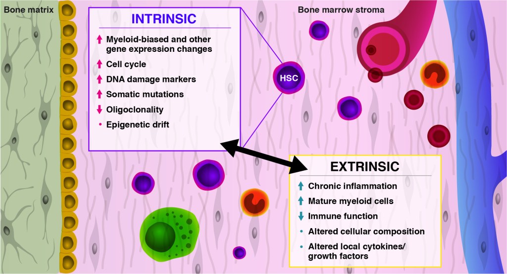 Our laboratory strives to how the HSC population is altered in the process of biological aging (including cell-intrinsic changes and changes in the bone marrow microenvironment where these cells reside, see Figure below), how and why seemingly benign somatic mutations in epigenetic regulatory genes are selected for in the HSC population with aging (termed clonal hematopoiesis), and the mechanisms by which, and extent to which, clonal hematopoiesis modifies risk of development of blood cancers including myelodysplastic syndrome (MDS) and acute myeloid leukemia (AML). Our long-term goal is to identify new intervention strategies to extend the “healthspan” of HSCs by maintaining their robust regeneration capacity into older age and reducing risk of development of blood cancers.